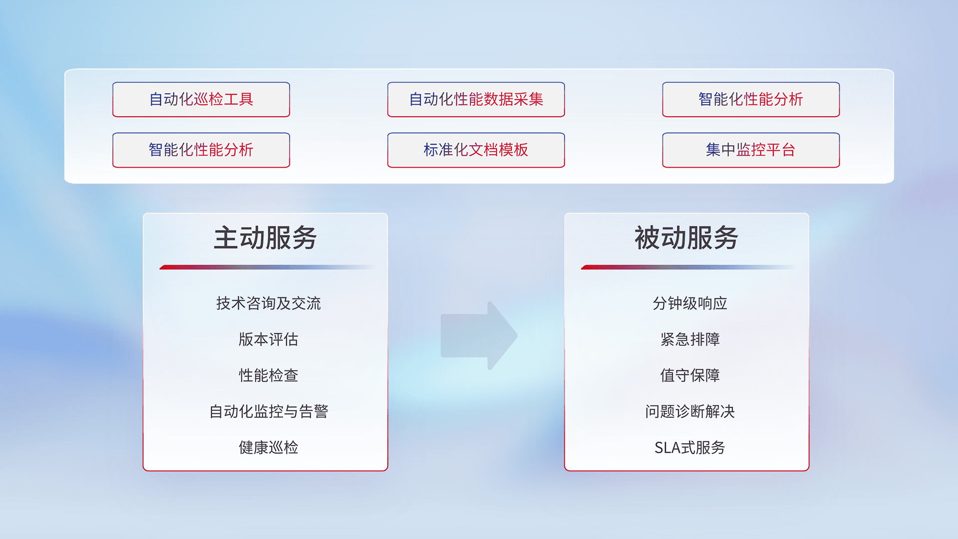 智能化工具和标准化文档,,,,保障服务质量,,,,提供主动服务(包含技术咨询、、、、版本评估、、、性能检查、、、、自动化监控与告警、、、健康巡检)和被动服务包含(分钟级响应、、、、紧急排障、、值守保障、、问题诊断解决、、、SLA服务)。。。