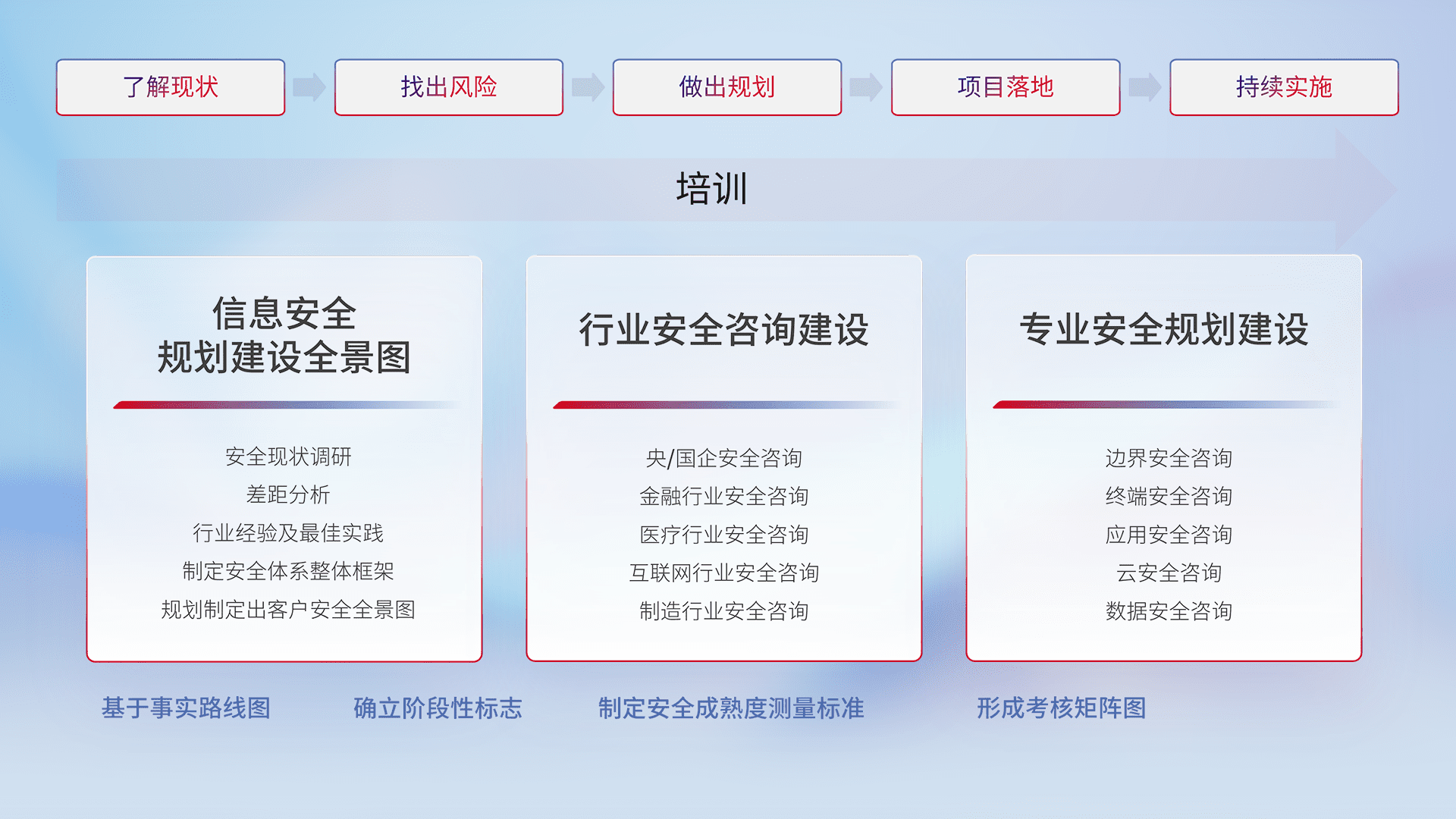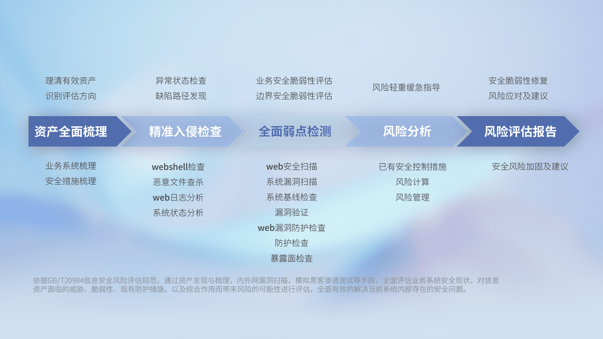 针对客户行业特性,,,以专业的安全服务+多厂商联合解决方案提供专属的一站式安全管理服务,,,,帮助客户全面感知网络空间威胁,,,基于识别、、、、检测、、分析、、、防护、、、监测、、响应的服务理论模型,,,,从方案咨询、、、、集成交付、、、、评估验证、、、优化加固、、、、运维运营,,致力于为客户提供完整的闭环管理式安全服务。。。以实战经验为客户打造高抵御风险的安全体系,,,,帮助客户发现威胁、、对抗威胁、、、、处置威胁,,不断积累安全对抗能力,,,,持续保障数字化安全。。